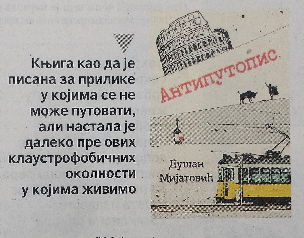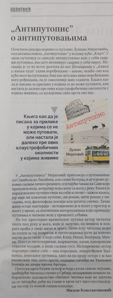 У културној рубрици дневног листа Политика (издање: 8. фебруар 2022.), на страни бр. 13, можете да прочитате текст преводиоца Милоша Константиновића о књизи Антипутопис, адвоката Душана Мијатовића.